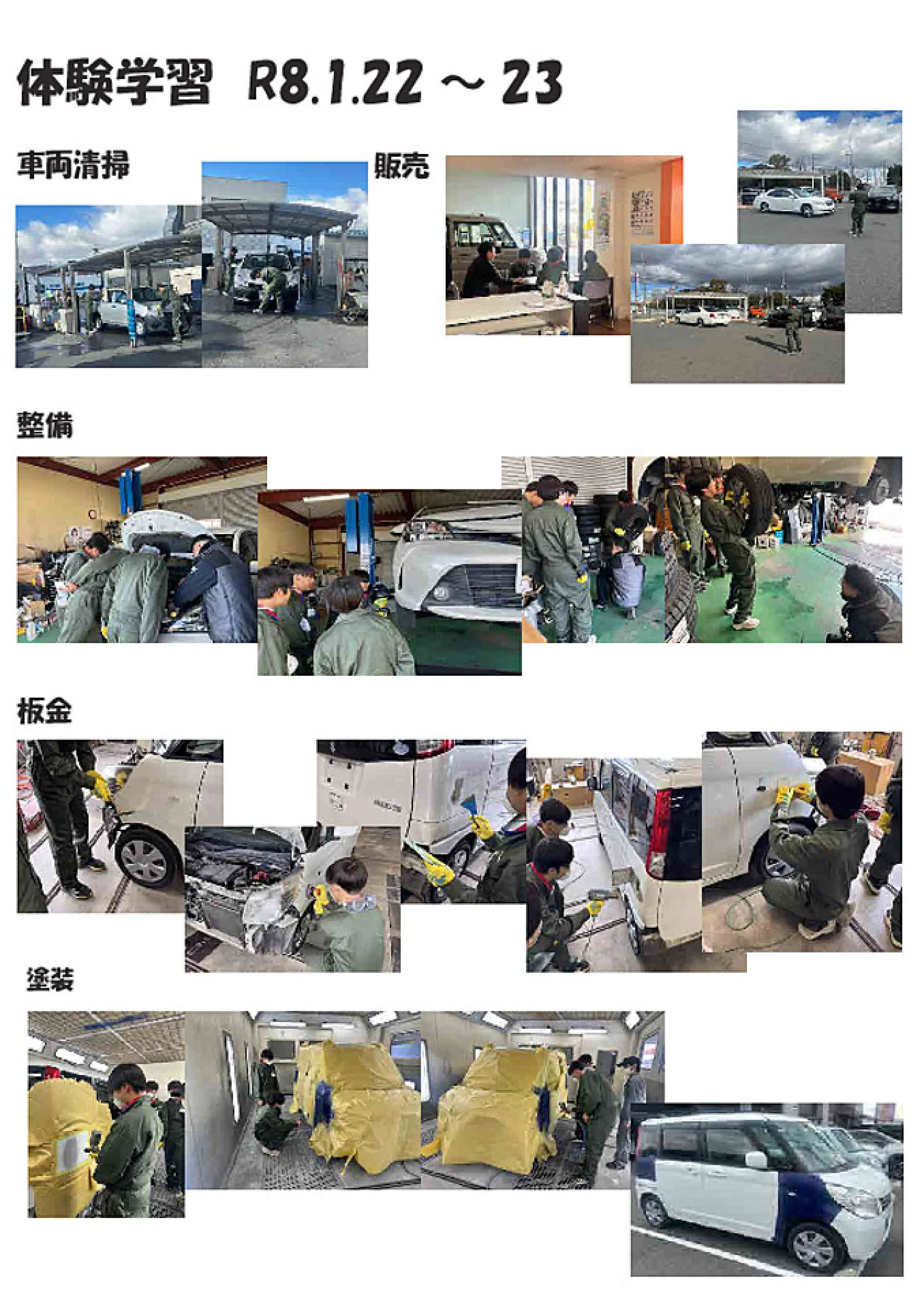 体験学習により挨拶、マナー、コミュニケーション能力を学んでいただき、自動車の整備を通じ成し遂げた時の達成感やお客様に感謝される喜びを知ることが出来ます。